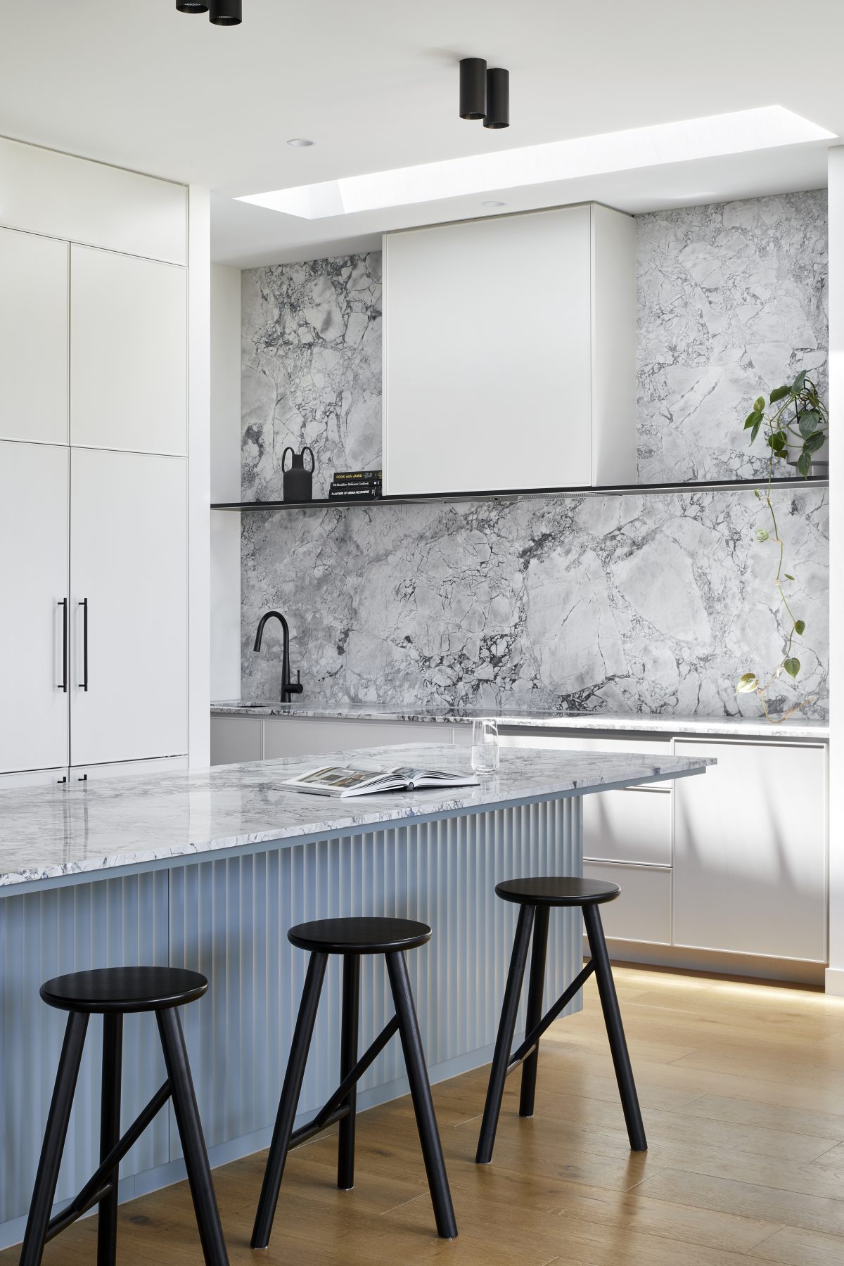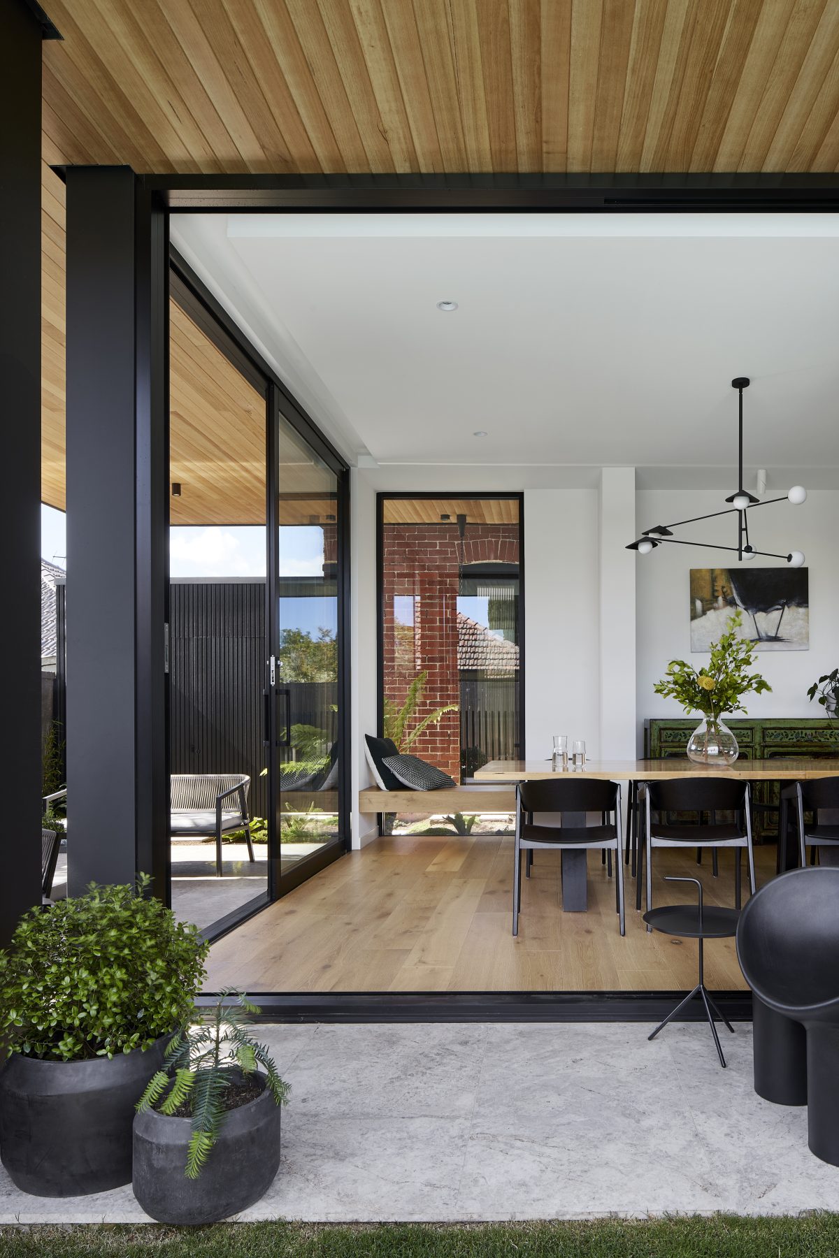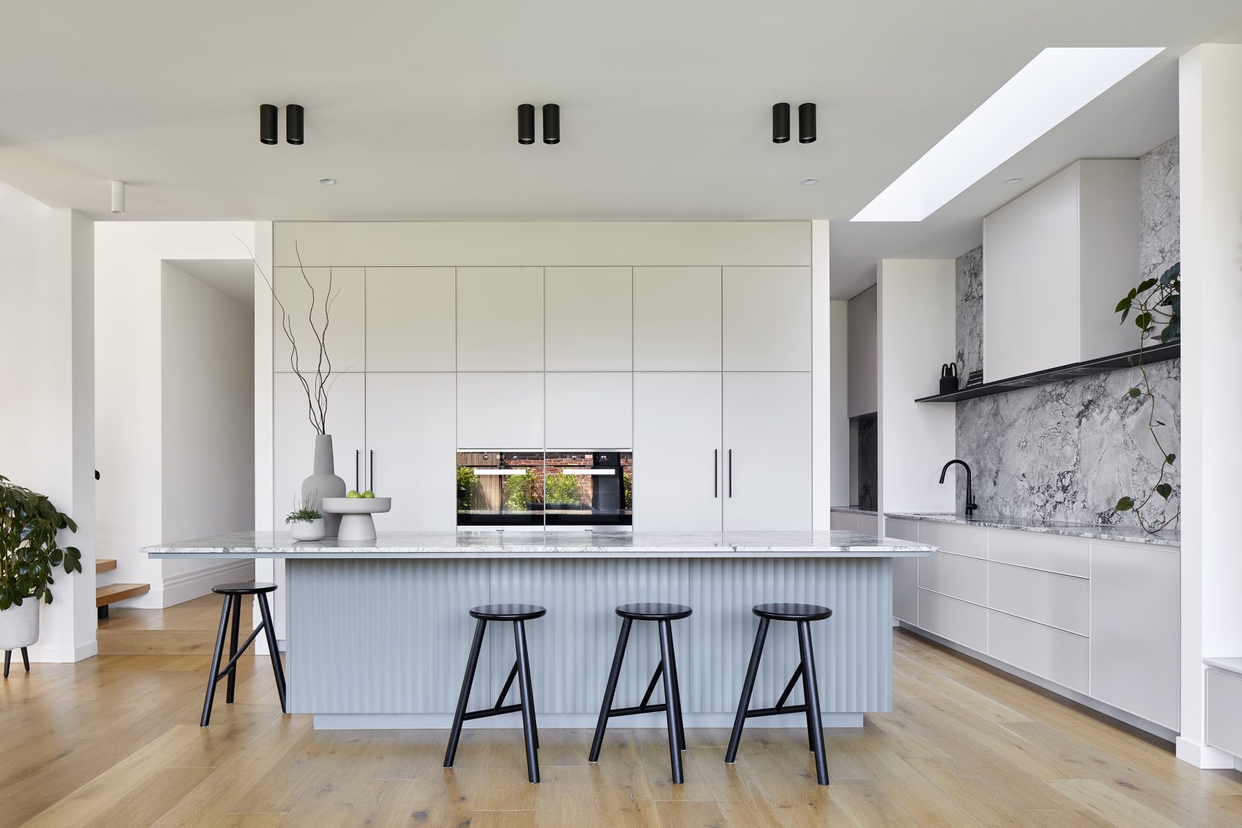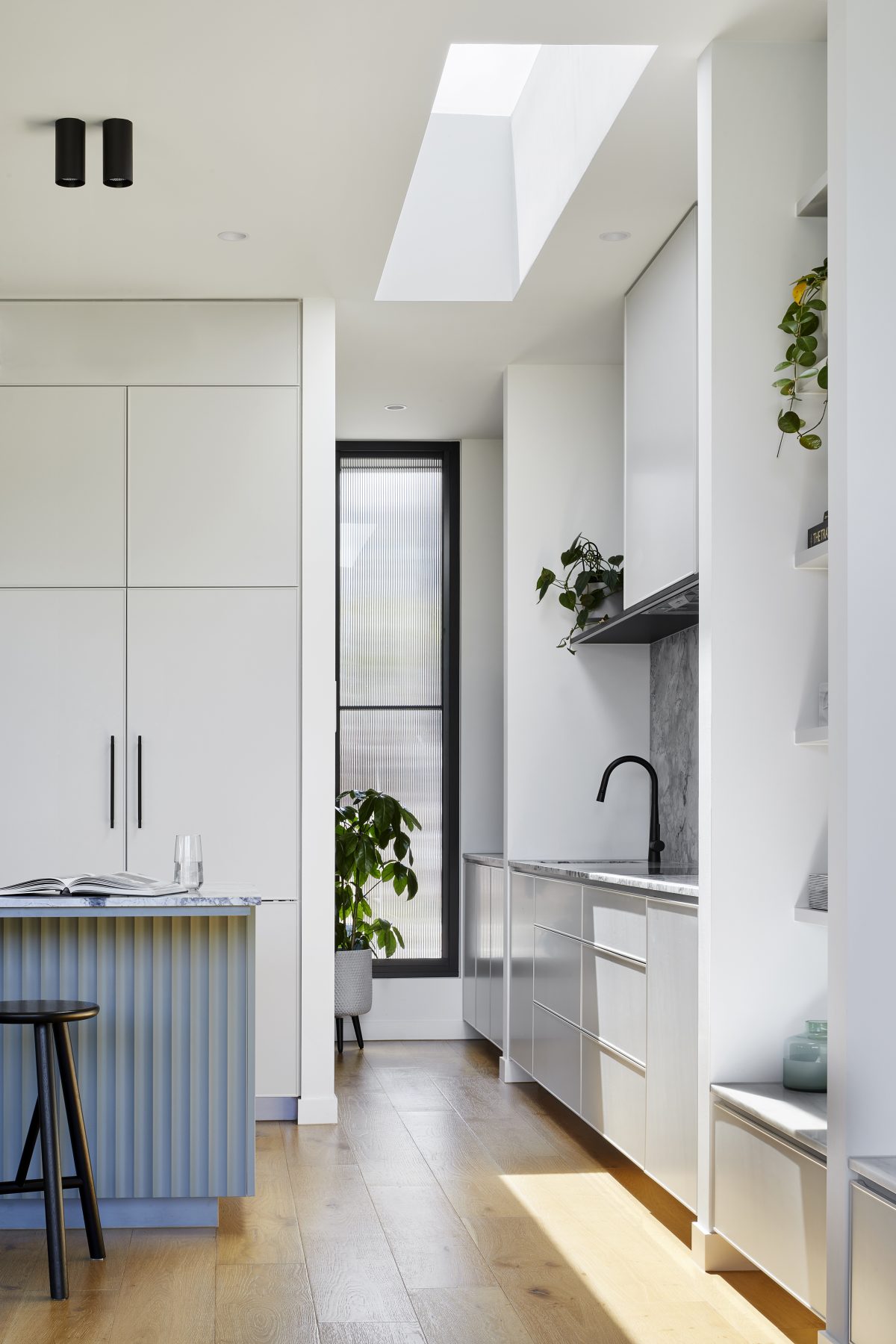 We teamed up with Aydan over at AdDesign to tackle this project. We knocked over the house’s back half, then extended both out and up. For the fresh new interiors, we used fluted glass windows, endless amounts of joinery and a black steel staircase up to the new first floor.